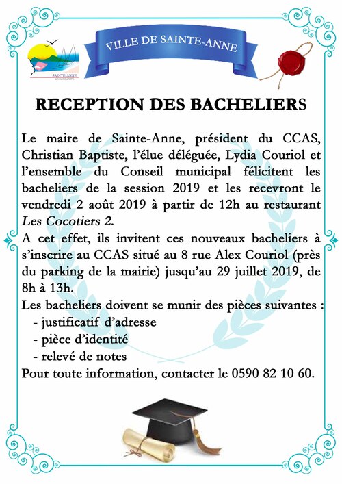 Le maire de Sainte-Anne, président du CCAS, Christian Baptiste, l’élue déléguée, Lydia Couriol et l’ensemble du Conseil municipal félicitent les bacheliers de la session 2019 et les recevront le vendredi 2 août 2019 à partir de 12h au restaurant Les Cocotiers 2.