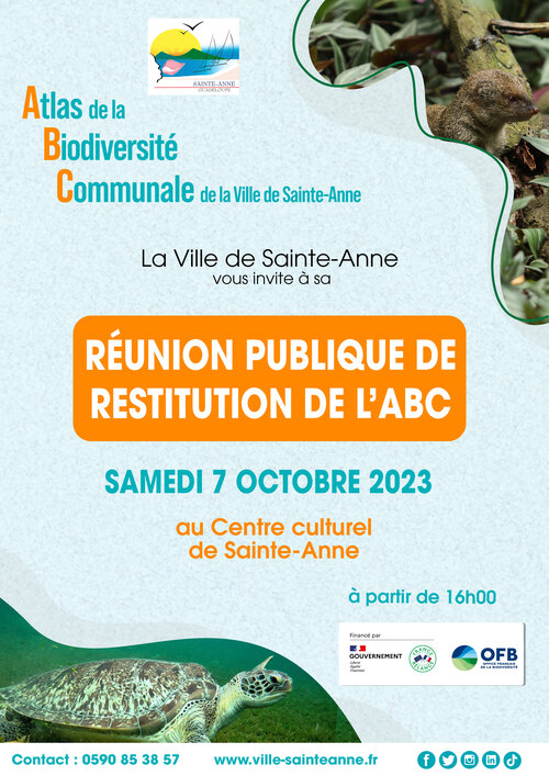 Dans le cadre de la réalisation de l’Atlas de la Biodiversité Communale (ABC) de la Ville Sainte-Anne, la population est invitée à participer à la réunion publique de restitution des travaux qui se tiendra le samedi 7 octobre 2023 à 16h, au Centre Culturel, en présence de L’Office Français de la Biodiversité (OFB) et du bureau d’études BIOTOPE.