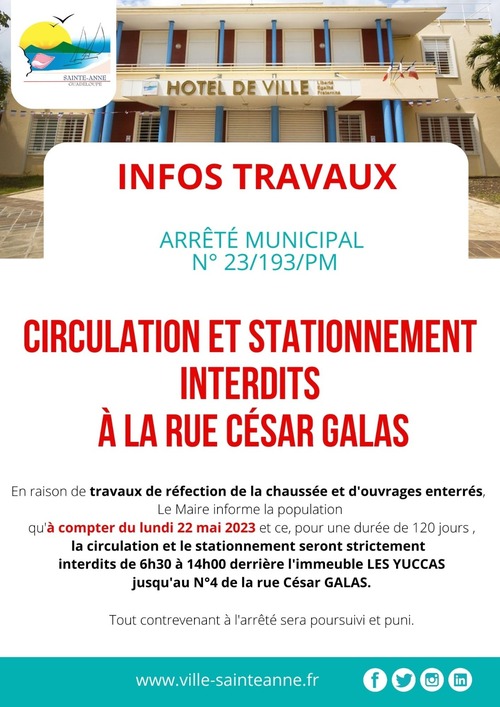 En raison de travaux de réfection de la chaussée et d’ouvrages enterrés, le Maire informe la population qu’à compter de ce lundi 22 mai 2023 et ce, pour une durée de 120 jours, la circulation et le stationnement sont strictement interdits de 6h30 à 14h00 derrière l’immeuble LES YUCCAS jusqu’au n°4 de la rue César GALAS, conformément à l’arrêté municipal n°23/193/PM.