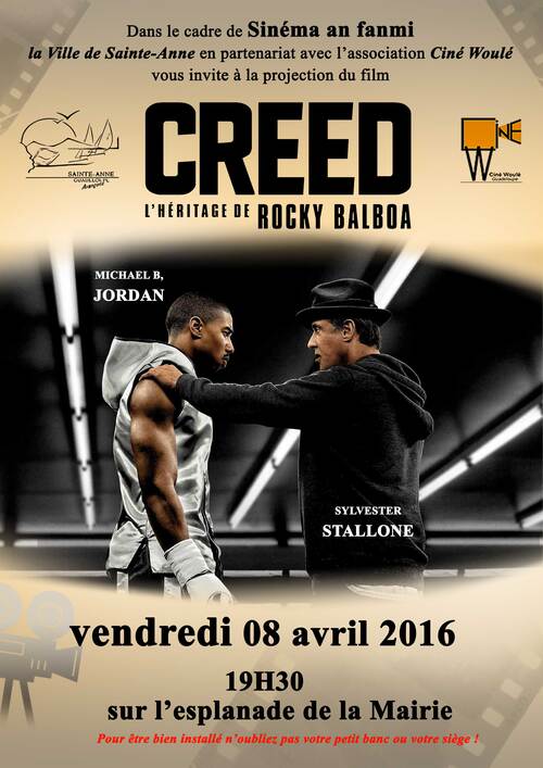 Dans le cadre de son opération Sinéma an fanmi, la ville de Sainte-Anne en partenariat avec l’association Ciné-Woulé, organise la projection en plein air du film "CREED l’héritage de ROCKY BALBOA", le vendredi 8 avril 2016 à 19h30 sur l’esplanade de la mairie.
