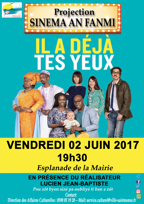 En partenariat avec l’association Ciné-Woulé, la Ville de Sainte-Anne vous invite à la projection de la comédie : "Il a déjà tes yeux" réalisé par Lucien Jean Baptiste, qui nous fera l’honneur de sa présence.