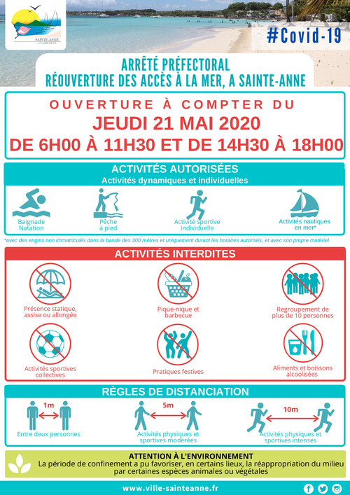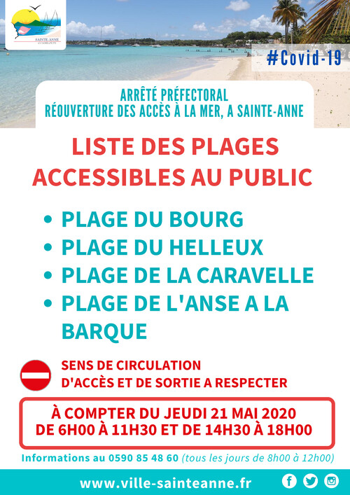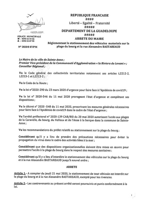 La ville de Sainte-Anne informe qu’à compter du jeudi 21 mai 2020, le stationnement de tout véhicule est interdit sur la plage du bourg et à la rue Alexandre Bastareaud, excepté pour les riverains. Les contrevenants s’exposent à des poursuites et seront punis conformément à la loi