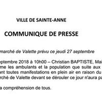 Le maire Christian baptiste informe les ambulants et la population que suite aux déclarations préfectorales interdisant toutes manifestations en plein air en raison du passage de la tempête Kirk, le marché de Valette de ce jeudi 27 septembre n’aura pas lieu.
