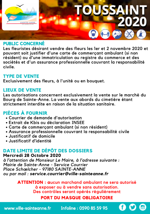 Les autorisations concernent exclusivement la vente sur le marché du Bourg de Sainte-Anne. La vente aux abords du cimetière étant strictement interdite en raison de la situation sanitaire.