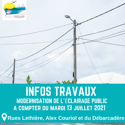 La Ville de Sainte-Anne Guadeloupe informe ses administrés que des travaux de rénovation de l’éclairage public se dérouleront à partir du mardi 13 juillet 2021 et ce pour une durée de 10 jours aux rues Lethière, Alex Couriol et du Débarcadère.