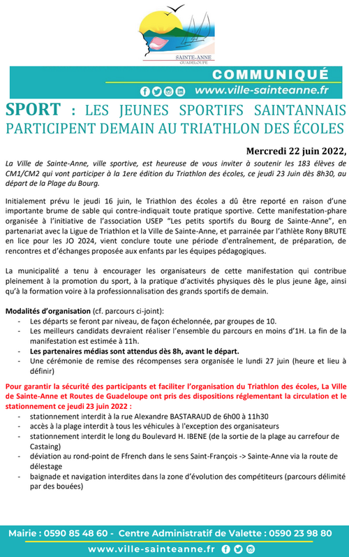 Juin 2022La Ville de Sainte-Anne, ville sportive, est heureuse de vous inviter à soutenir les 183 élèves de CM1/CM2 qui vont participer à la 1ère édition du Triathlon des écoles, ce jeudi 23 Juin dès 8h30, au départ de la Plage du Bourg.