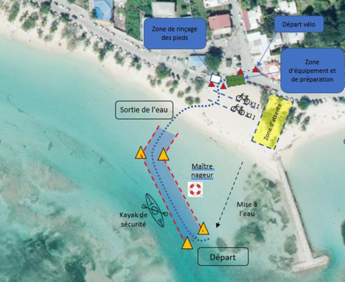 - baignade et navigation interdits dans la zone d’évolution des compétiteurs (parcours délimité par des bouées)