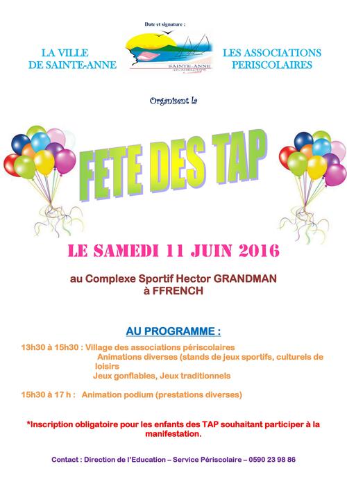 La municipalité organise la première fête des Temps d’Activités Périscolaires (TAP), le samedi 11 juin à partir de 13h30 au complexe sportif Hector GRANDMAN à Ffrench.
