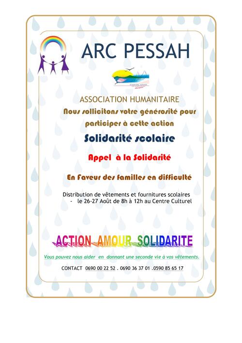 La distribution de vêtements et fournitures scolaires organisée par l’ARC PESSAH et la Ville de Sainte-Anne, prévue initialement les 24 et 26 août 2016 en mairie est reportée aux 26 et 27 août de 8h à 12h au centre culturel.