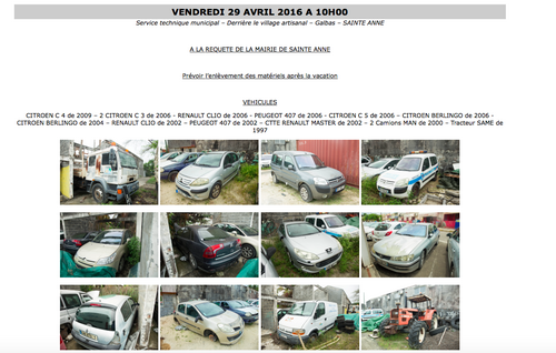 La vente, organisée par un commissaire-priseur, se déroulera le vendredi 29 avril 2016 à 10h au Centre Technique Opérationnel des Galbas (anciennement appelé parc automobile du service technique) et sera accessible au grand public.