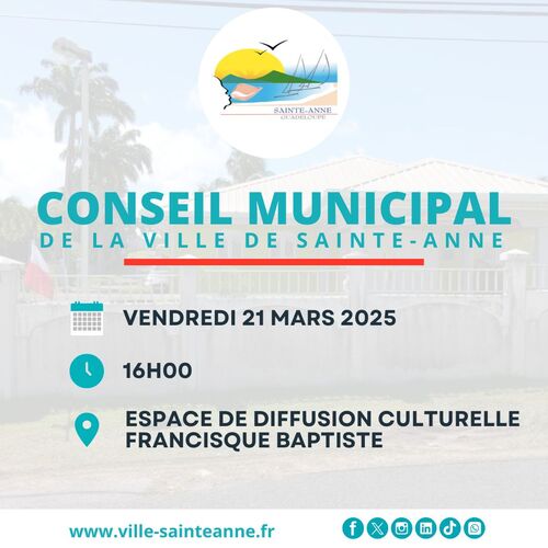 17 marsLa Ville de Sainte-Anne vous informe de la tenue de son prochain Conseil Municipal le vendredi 21 mars 2025 à 16h à l’Espace de diffusion culturelle Francisque Baptiste, situé au 30 rue Paulin Chipotel à Montmain.