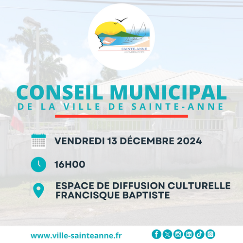 Décembre 2024La Ville de Sainte-Anne vous informe de la tenue de son prochain Conseil Municipal le vendredi 13 décembre 2024 à 16h à l’Espace de diffusion culturelle Francisque Baptiste, situé 30 rue Paulin Chipotel à Montmain.