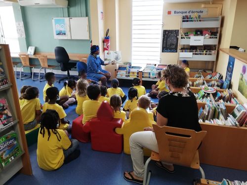 Retour en images sur la visite des élèves de 2 classes de l’école mixte 2 Ginette Maragnes à la Bibliothèque Osange Talis Gane.