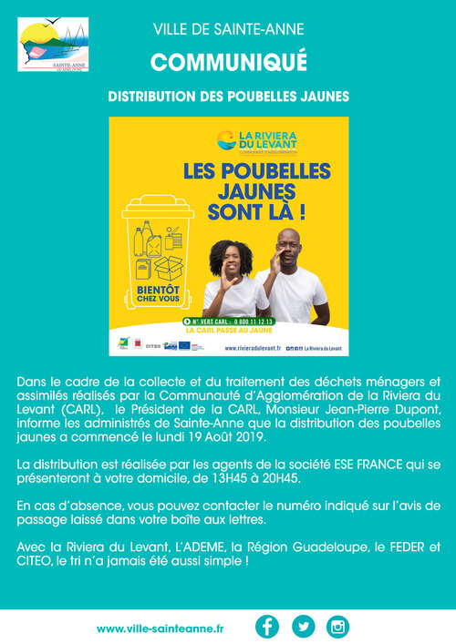 Dans le cadre de la collecte et du traitement des déchets ménagers et assimilés réalisés par la Communauté d’Agglomération de la Riviera du Levant (CARL), le Président de la CARL, Monsieur Jean-Pierre Dupont, informe les administrés de Sainte-Anne que la distribution des poubelles jaunes a commencé le lundi 19 Août 2019.