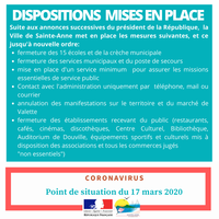 Avec l’entrée en vigueur immédiate de l’interdiction de tout rassemblement ou de regroupement familial, tous les évènements organisés sur le territoire sont annulés, ainsi que le marché de Valette qui a lieu le jeudi. Les centres sociaux, associations, clubs sportifs, opérateurs culturels doivent respecter les consignes du Gouvernement et suspendre toutes leurs activités.