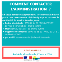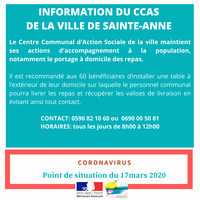*Concernant le portage à domicile, le CCAS de la Ville de Sainte-Anne invite chaque bénéficiaire à installer une table à l’extérieur de son domicile sur laquelle le personnel communal pourra livrer les repas et récupérer les valises de livraison en évitant ainsi tout contact. Les personnes domiciliées au CCAS pourront aussi récupérer de 7h30 à 12h30, leur courrier afin d’éviter toute rupture de droit.