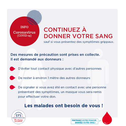 - Le personnel de l’EFS et tous les donneurs doivent impérativement respecter les gestes barrières pour limiter les risques de transmission du virus.