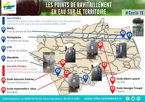 EAU A USAGE DOMESTIQUE, NON POTABLE disponible du lundi au samedi, de 8h à 12h via les citernes installées dans les écoles de Ffrench, Maudette (x2 points), Douville et Fouché/Deshauteurs