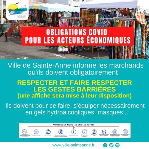 La Ville de Sainte-Anne informe les marchands qu’ils doivent obligatoirement RESPECTER ET FAIRE RESPECTER LES GESTES BARRIÈRES (une affiche sera mise à leur disposition).