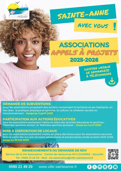 Pour tout renseignement, contacter le Centre de Ressources de Douville au 0590 21 49 29 le lundi de 7h30 à 16h30, les mardis et jeudis de 7h30 à 14h30 et les mercredis et vendredis de 7h30 à 13h30 ou par mail à l’adresse vie-associative@ville-sainteanne.