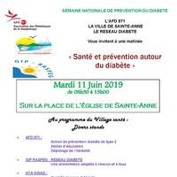Dans le cadre de la Semaine nationale de prévention du diabète, l’AFD 971, Ville de Sainte-Anne Guadeloupe et Le réseau diabète vous invitent à une matinée "Santé et prévention autour du diabète" le Mardi 11 Juin 2019 de 08h30 à 13h00 sur la place de l’église de Sainte-Anne.