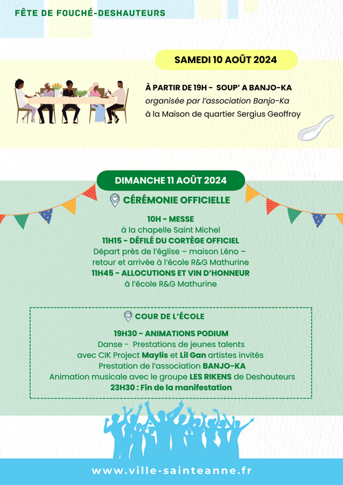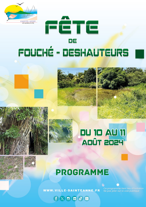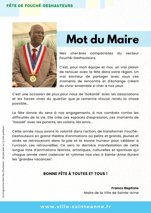 Cette année nous avons la volonté dans l’action, de transformer Fouché-Deshauteurs en grand théâtre d’animations où petits et grands, jeunes et aînés se retrouveront dans la joie et la bonne humeur pour célébrer à l’unisson ces retrouvailles. Ce sera la dernière manifestation de cette longue liste d’animations festives, artistiques, culturelles et sportives qui chaque année vient cadencer et rythmer nos vies à Sainte-Anne durant les "grandes vacances".