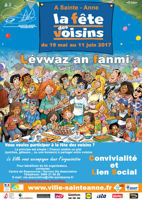 Cette année, la Ville de Sainte-Anne est heureuse d’annoncer qu’elle s’associe à la prochaine édition de la Fête des voisins, qui organisée du 19 mai au 11 juin 2017, a pour but d’offrir un moment de convivialité entre habitants d’un même immeuble, d’une même rue ou du même quartier, le temps d’un repas ou d’une collation.