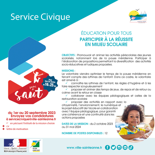 Dans le cadre de ses actions d’animation et d’accompagnement de la jeunesse, la Ville accueillera donc 12 jeunes, sans condition de diplôme, pour des missions d’une durée de 8 mois sur la thématique de l’Education pour tous :