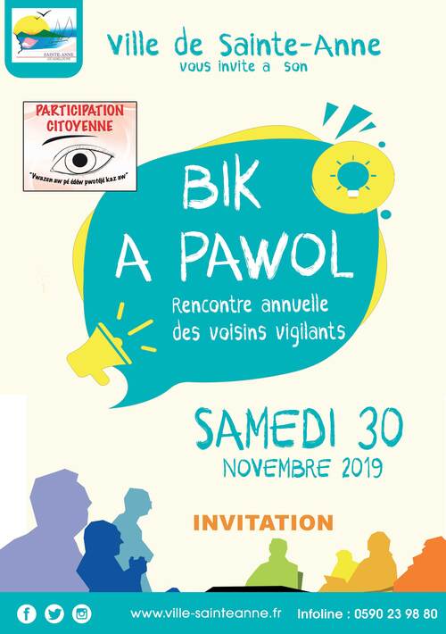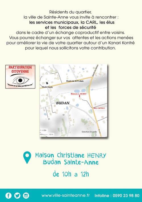 Novembre 2019Dans le cadre du dispositif de participation citoyenne mis en place dans le quartier Budan, la Ville de Sainte-Anne invite les résidents à participer à la rencontre annuelle des "Voisins Vigilants", le samedi 30 novembre de 10h à 12h, à la maison Christiane Henry. Venez nombreux échanger sur votre quartier avec les services municipaux, intercommunaux, la police municipale, la gendarmerie et les élus.
