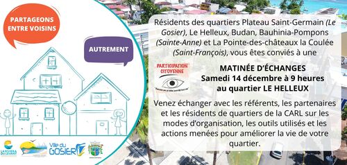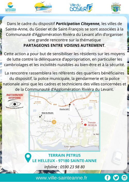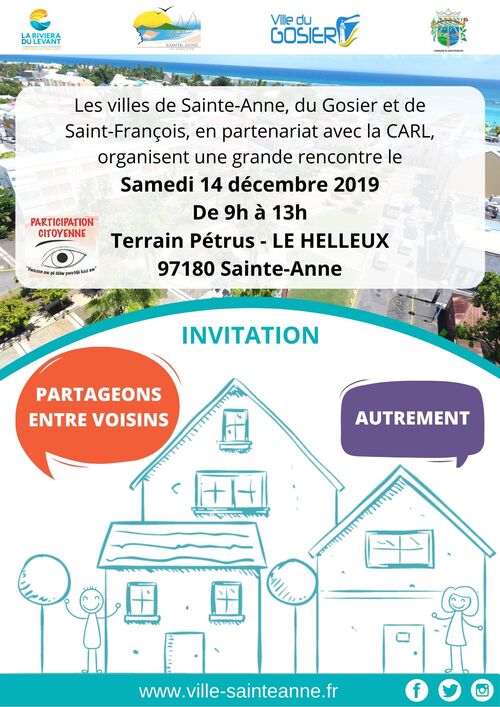 Dans le cadre du dispositif Participation Citoyenne, les villes de Sainte-Anne, du Gosier et de Saint-François se sont associées à la Communauté d’Agglomération Riviéra du Levant afin d’organiser une grande rencontre sur la thématique PARTAGEONS ENTRE VOISINS AUTREMENT.