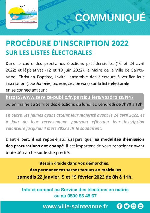 Pour toute information complémentaire, les administrés peuvent se rapprocher du Service des élections en mairie ou par téléphone au 0590 85 48 67