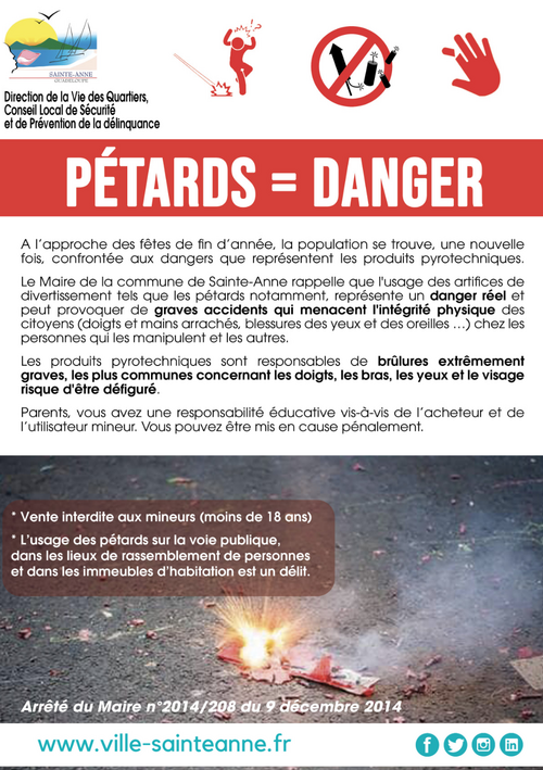 Le Maire de la Ville de Sainte-Anne Francs Baptiste rappelle que l’utilisation des pétards sur la voie publique, dans les lieux de rassemblement et dans les immeubles d’habitation est un délit, et que leur vente est strictement interdite aux mineurs, conformément à l’arrêté municipal 2014/208 du 9 décembre 2014.
