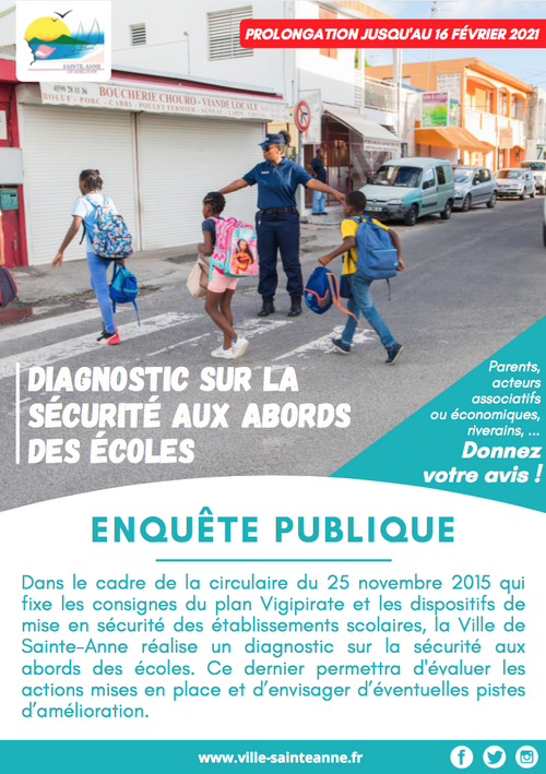 Pour rappel, cette enquête s’inscrit dans le cadre du projet "DIAGNOSTIC DE SÉCURITÉ AUX ABORDS DES ÉTABLISSEMENTS SCOLAIRES" porté par la Direction de la Vie des Quartiers de la Ville de Sainte-Anne, afin d’évaluer les actions mises en place et d’envisager d’éventuelles pistes d’amélioration pour les 5 prochaines années.