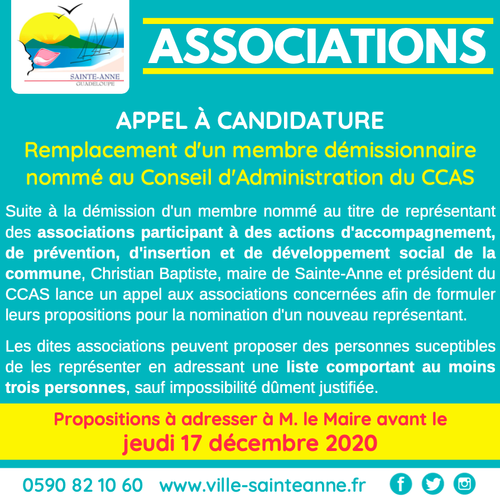 Suite à la démission d’un membre nommé au titre de représentant des associations participant à des actions d’accompagnement, de prévention, d’insertion et de développement social de la commune, en date du 20 novembre 2020, Christian Baptiste, maire de la Ville de Sainte-Anne et président du CCAS lance un appel aux associations concernées afin de formuler leurs propositions pour la nomination d’un nouveau représentant.