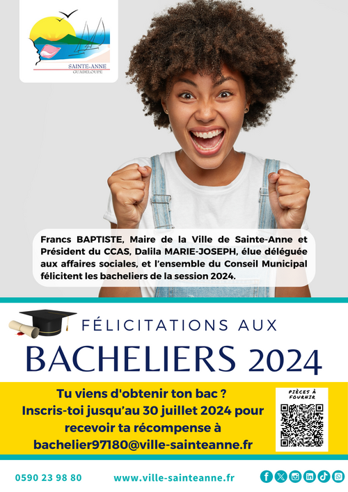 Francs BAPTISTE, Maire de la Ville de Sainte-Anne et Président du CCAS, Dalila MARIE-JOSEPH, élue déléguée aux affaires sociales, et l’ensemble du Conseil municipal félicitent les bacheliers de la session 2024.