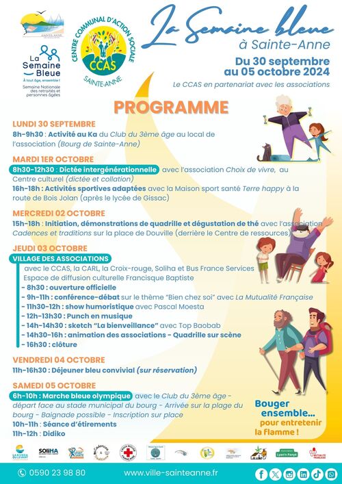 La Semaine Bleue à Sainte-Anne sera l’occasion de renforcer les liens intergénérationnels, de promouvoir l’activité physique pour tous et de mettre en avant la solidarité. À travers cet événement national, il s’agit pour la Ville d’inciter chaque citoyen à prendre conscience de l’importance de tisser des liens pour une société plus solidaire.