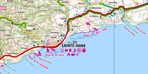 C’est une petite bande, assez urbanisée où se place le bourg de Sainte-Anne et sa zone périurbaine. Ce littoral est assez diversifié avec des anses et des criques plus ou moins humanisée, faites de roches calcaires ou de sable blanc : d’est en ouest on trouve, l’anse à Jacques, l’anse à Saint, l’anse à Eblain assez sauvages, la plage de la Caravelle, la plage des Galbas, la plage du bourg très touristiques et marquées par la présence d’activités nautiques, l’anse Du Belley où se pratique le kite surf, la longue plage de Bois Jolan très familiale et les plages de l’anse Gros Sable et l’anse à la Barque où l’on trouve des vagues de surf.