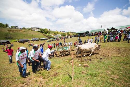 Les concours de bœufs-tirants sont très prisés des Guadeloupéens Le but est d’opposer des attelages de deux animaux tirant successivement une charrette lestée à flanc de colline.