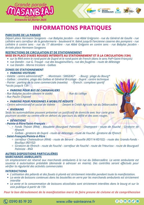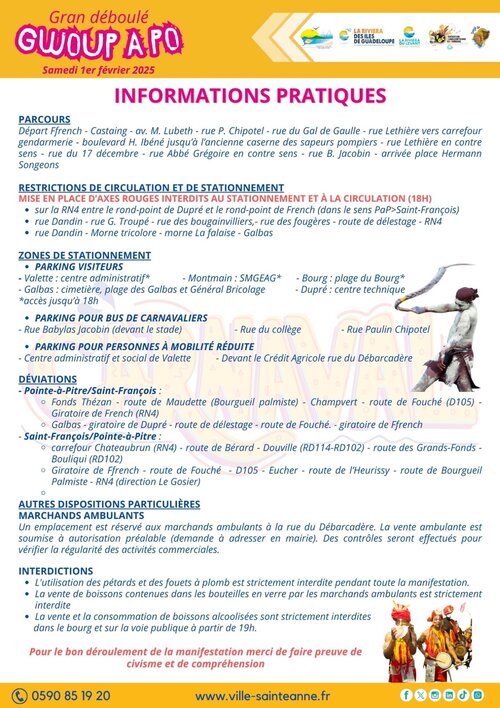 13 groupes sont attendus pour ce déboulé organisé par le Mouvam kiltirèl Sonjé Sa : Mas ka klé, Ti kanno, Yo min’m, Mangrov’la, Masayo, Mas’ay, Moun ki moun, Nasyon a nèg mawon, 50/50, Radikal mas, Masko, Nukila et bien sûr Sonjé sa. Le départ est prévu à 19h au stade de Ffrench, pour une arrivée prévue sur le parking du stade de Valette.