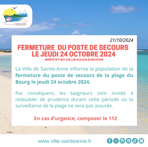 La Ville de Sainte-Anne informe la population de la fermeture du poste de secours de la plage du Bourg le jeudi 24 octobre 2024, conformément à l’arrêté municipal n°F.B/F.C/K.L/B-N.B-A/G.R/2024/395 consultable ci-dessous.