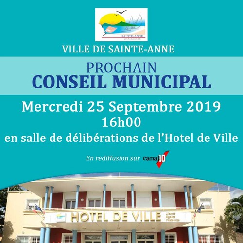 Ce mercredi 25 septembre 2019, à 16 heures en salle des délibérations de la mairie, les conseillers municipaux se réuniront à l’occasion de la 5ème session ordinaire du Conseil Municipal de la ville de Sainte-Anne.