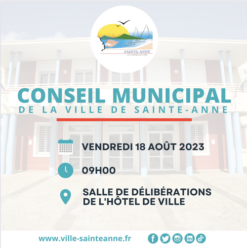 Août 2023Une réunion du Conseil Municipal de la Ville de Sainte-Anne se déroulera ce vendredi 18 août 2023 à 9h en salle de délibérations de l’Hotel de Ville.