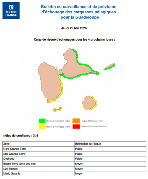Les modèles de dérive des sargasses indiquent un risque d’échouage moyen pour la fin de semaine. Des quantités importantes de sargasses persistent toutefois en Atlantique et pourraient être source d’échouages importants dans les semaines à venir.