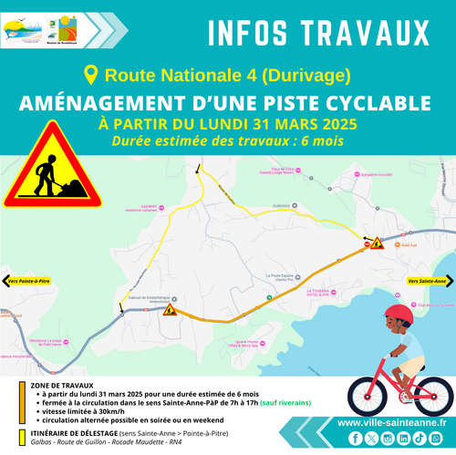 - zone de travaux fermée à la circulation dans le sens Sainte-Anne > Pointe-à-Pitre, du lundi au vendredi de 7h à 17 (sauf riverains)