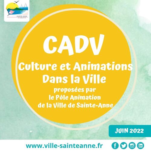 Juin 2022La Ville de Sainte-Anne, Ville culturelle et sportive à la plaisir de vous présenter le programme d’animations culturelles, sportives et numériques du mois de Juin 2022. Vous découvrirez les évènements autour de la fête de la musique ainsi que la programmation proposée par le Pôle Animation de la Ville et les associations du territoire.