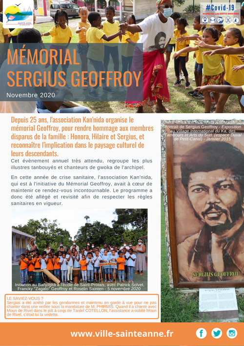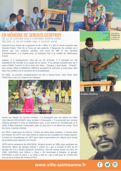 13h30 - 15h30 : initiation des élèves de l’école de Saint-Protais aux musiques traditionnelles guadeloupéennes : lewoz, gwoka, banjogita et quadrille - découverte d’instruments tels que la kalbas, le tibwa, le wacha ou encore les klav - en présence de Patrick Solvet, élu de la Ville de Sainte-Anne délégué à la culture, Francky "Zagalo" Geoffroy, frère de Sergius Geoffroy et Roselin Sainten, président de l’association Cadences et Traditions et de la Fédération de quadrille de Guadeloupe
