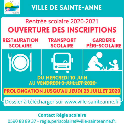 La Ville de Sainte-Anne informe les parents d’élèves que la date limite pour les formalités d’inscription à la cantine, à la garderie périscolaire et au transport a été reportée au jeudii 23 juillet 2020.