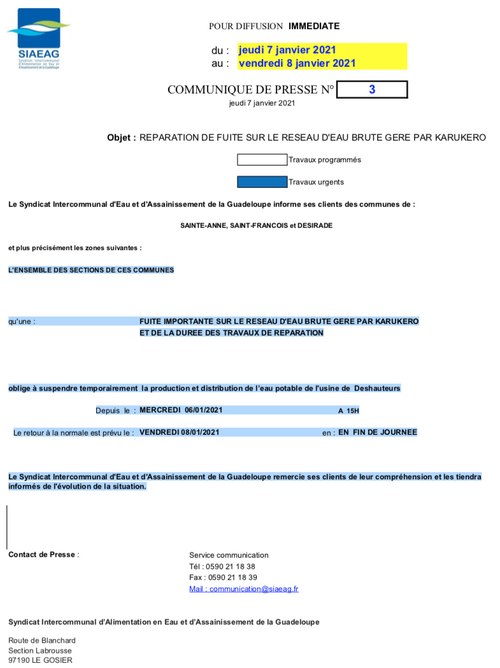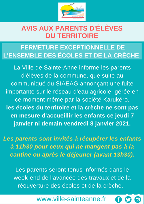 La Ville de Sainte-Anne informe les parents d’élèves de la commune, que suite au communiqué du SIAEAG annonçant une fuite importante sur le réseau d’eau agricole, gérée en ce moment même par la société Karukéro, les écoles du territoire et la crèche ne sont pas en mesure d’accueillir les élèves ce jeudi 7 janvier ni demain vendredi 8 janvier 2021.