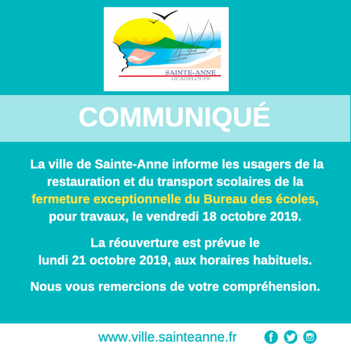 La ville de Sainte-Anne informe les usagers de la restauration et du transport scolaires de la fermeture exceptionnelle du Bureau des écoles, pour travaux, le vendredi 18 octobre 2019.