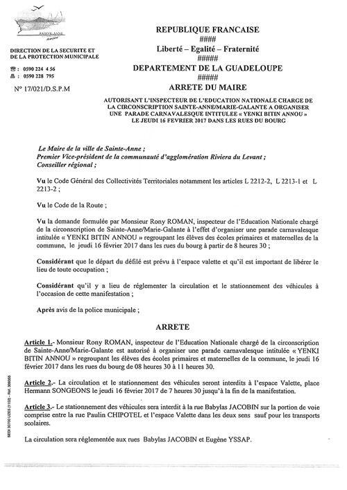 Christian Baptiste, Maire de la Ville de Sainte-Anne informe la population que la parade carnavalesque des élèves de la ville intitulée « Yenki biten an nou » aura lieu le Jeudi 16 février 2017 dans les rues du bourg à partir de 8h30.